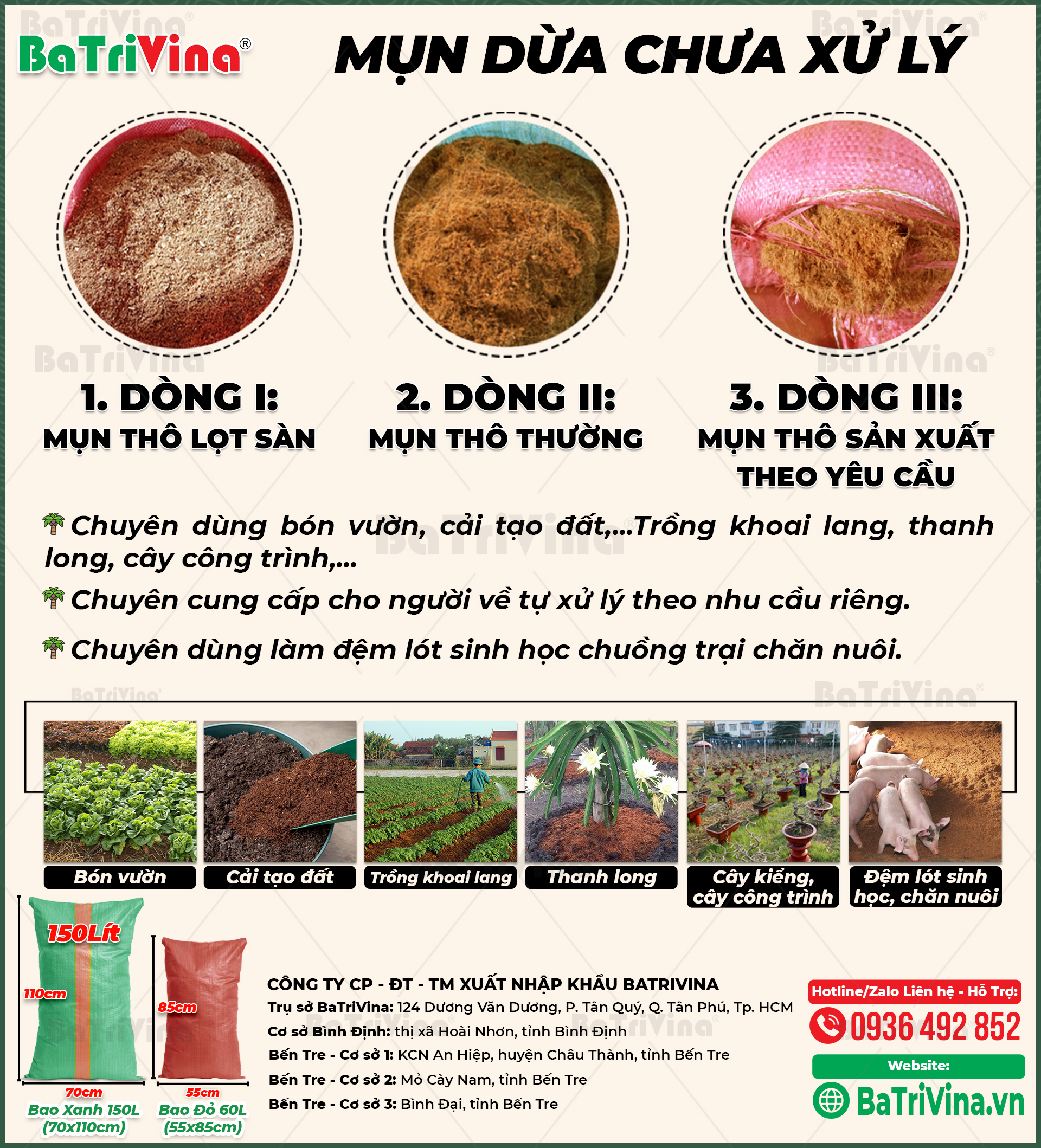 Với Mụn dừa đã xử lý, BaTriVina cung cấp 3 dòng từ cao cấp đến phổ thông để phục vụ cho nhiều công việc: